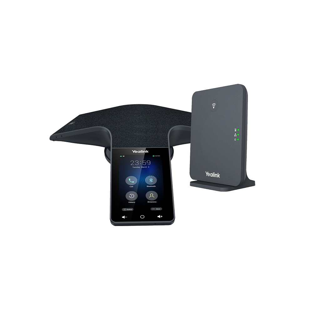 Yealink CP935W-Base — это беспроводной сенсорный конференц-телефон корпоративного уровня для конференц-залов малого и среднего размера. Отличительной особенностью устройства является возможность подключения как по стандарту DECT к базовой станции Yealink W70B (входит в комплектацию) с расширением дальности действия до 50 м и сохранения стабильности сигнала, так и регистрация SIP-аккаунта непосредственно через Wi-Fi.