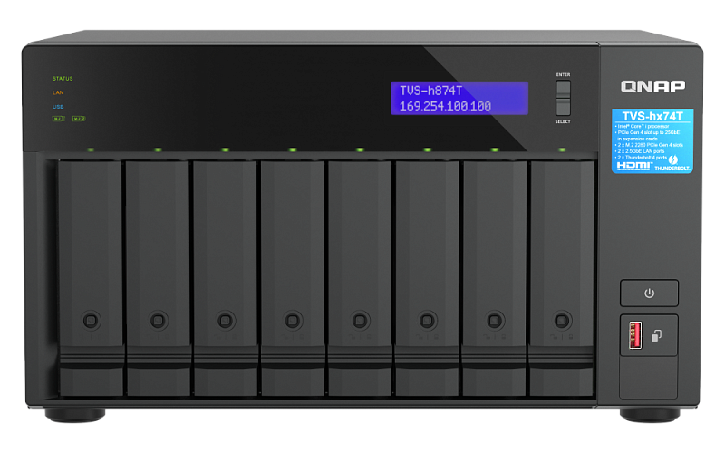 NAS TVS-h874T от QNAP – это высокопроизводительное сетевое хранилище, оснащенное интерфейсом Thunderbolt™ 4 и предназначенное для профессиональной работы с мультимедийным контентом.