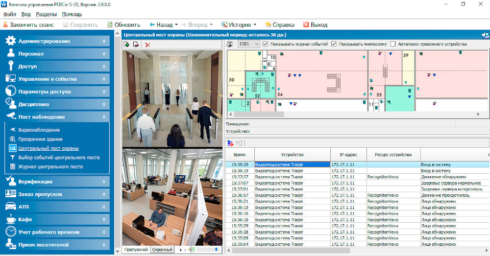 - Контроль над объектом в интерфейсе PERCo-S-20 с выводом «живого видео» с камер видеоподсистемы TRASSIR через раздел «Центральный пост охраны».
