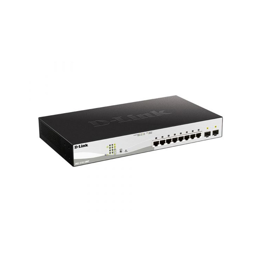Управляемый коммутатор D-Link DGS-1210-10MP/F3A оборудован десятью гигабитными портами: восемью RJ-45 c PoE (30 Вт на порт, общий бюджет — 130 Вт), двумя SFP.