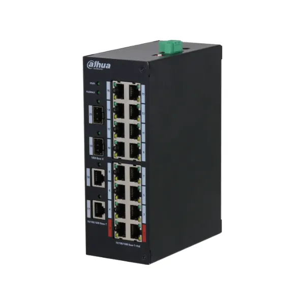 Представленный сетевой коммутатор предназначен для промышленных условий эксплуатации. Он оснащён 20 портами: 16 портов RJ45 с поддержкой PoE стандартов IEEE 802.3af/at/bt и скоростью передачи данных до 1000 Мбит/с, а также 2 порта RJ45 и 2 SFP порта для uplink-соединений со скоростью до 1000 Мбит/с.