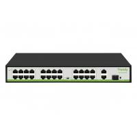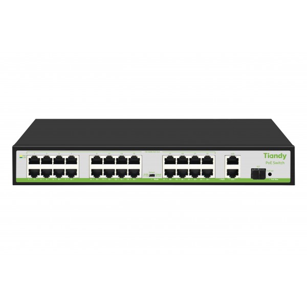 Данный неуправляемый PoE-коммутатор оснащен 27 портами: 24 RJ-45 порта с поддержкой PoE (скорость передачи данных 100 Мбит/с) и 3 uplink порта (2 RJ-45 порта со скоростью передачи данных 1 Гбит/с и 1 SFP порт со скоростью передачи данных 1 Гбит/с).
