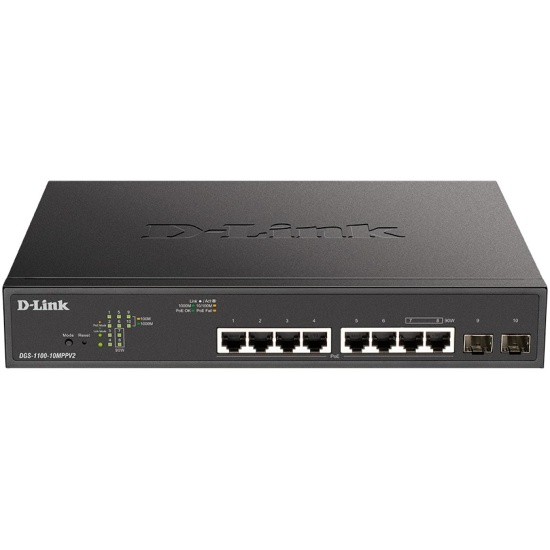 Восемь портов DGS-1100-10MPPV2 поддерживают стандарт IEEE 802.3at PoE, два из них соответствуют 802.3bt. Общий бюджет мощности составляет 242 Вт, что позволяет подключать к коммутатору устройства с поддержкой PoE.