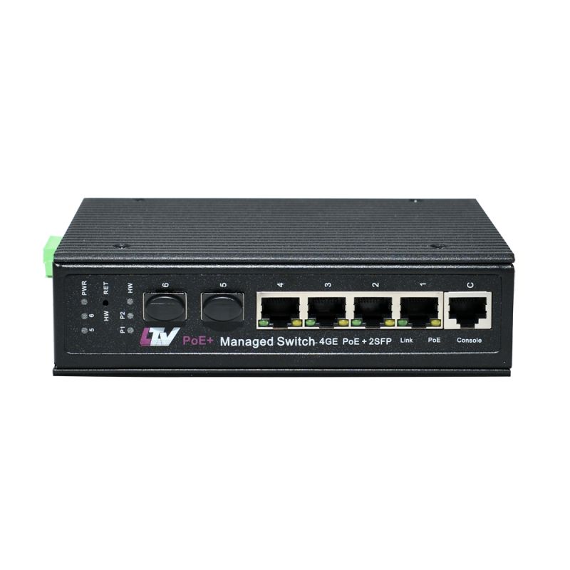 Представленный коммутатор является управляемым устройством, обеспечивающим передачу данных на расстояние до 100 метров. Он оснащен четырьмя портами RJ-45 с поддержкой PoE (Power over Ethernet) и двумя портами SFP для uplink-соединений.
