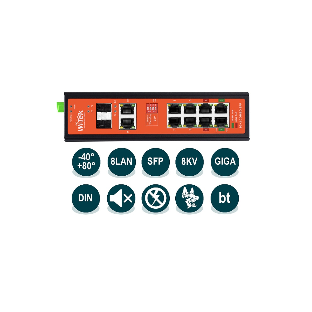 Коммутатор WI-PS310GF-I укомплектован прочным металлическим корпусом стандарта IP30 и может быть смонтирован на DIN-рейку, установлен на стол или на стену. Устройство предназначено для работы в условиях экстремальных температур от –40°C до +80°C и влажности до 90%, устойчиво к электромагнитным помехам и скачкам входного напряжения.