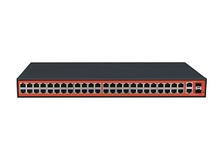Коммутатор оборудован 48 портами 100Base-TX с поддержкой стандартов PoE/PoE+ (802.3af/at) мощностью 700 Вт и 2 комбинированными портами GE/SFP.