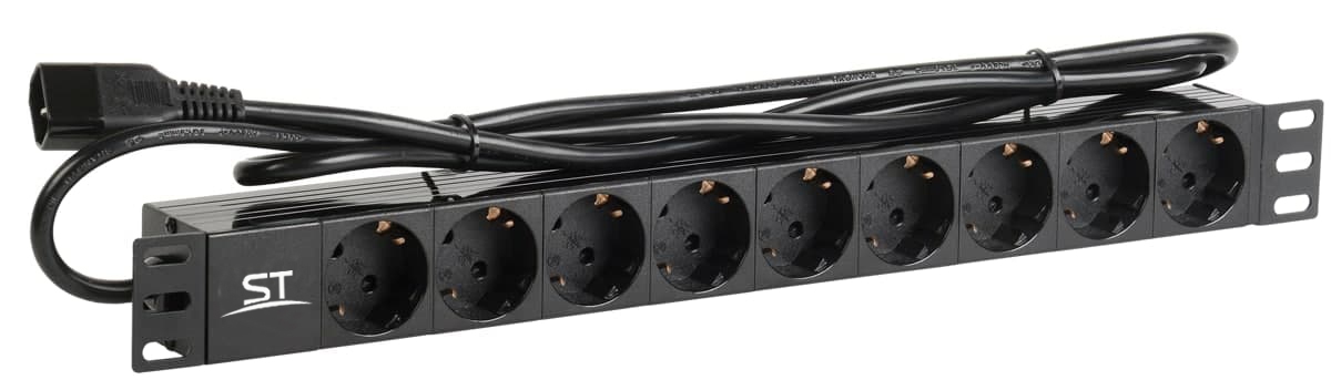Блок розеток ST-PDU-01, Предназначен для распределения питания однофазных электрических приемников (потребителей) переменного тока напряжением до 250В и частотой 50Гц, Электрическое подключение: Соединительный кабель с вилкой, Тип разъема: IEC 320 C14, Длина кабеля: 2 м, Общ количество розеток: 9, Номинальное напряжение: 230 В, Максимальное напряжение: 250 В, 50 Гц, 16 А, 3500 Вт, Сечение жил провода: 1,5 мм², Защита: Нет, Количество розеток стандарта C2а: 9, Материал корпуса: Пластик, 0…+40°С