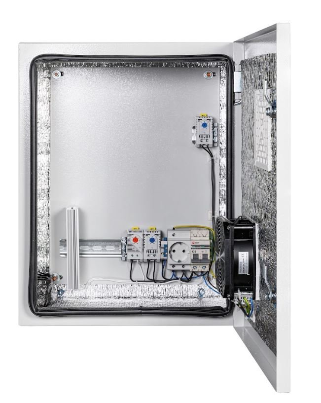 Система терморегуляции: Встроенный нагреватель 75 Вт, термореле, реле предстарта и вентилятор с решеткой и фильтром поддерживают оптимальную температуру внутри шкафа, предотвращая перегрев или переохлаждение оборудования.