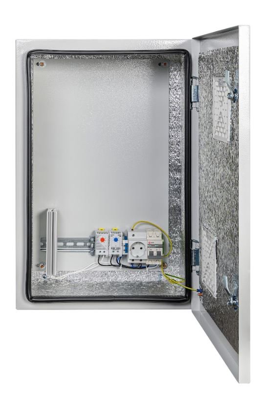 Шкаф соответствует классу защиты IP54 и способен работать в температурном диапазоне от -55 до +50°С.