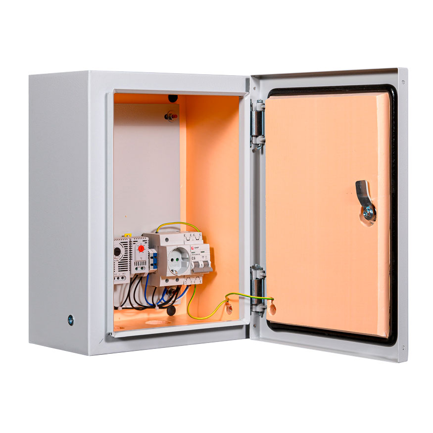 Монтажная плата с DIN-рейкой, розетка и автоматический выключатель обеспечивают удобство монтажа и подключения оборудования. Гигростат защищает оборудование от воздействия влаги, а гермовводы препятствуют попаданию воды внутрь шкафа. Утеплитель из пенополистирола способствует поддержанию оптимальной температуры.