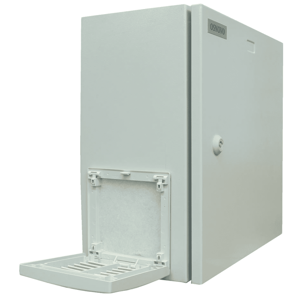 * Система обогрева: Состоит из конвективного обогревателя на DIN-рейке и термостата (Н-З, до +15 ºС), а также слоя теплоизоляции внутри корпуса шкафа. Обеспечивает поддержание внутренней температуры выше 0 ºС.