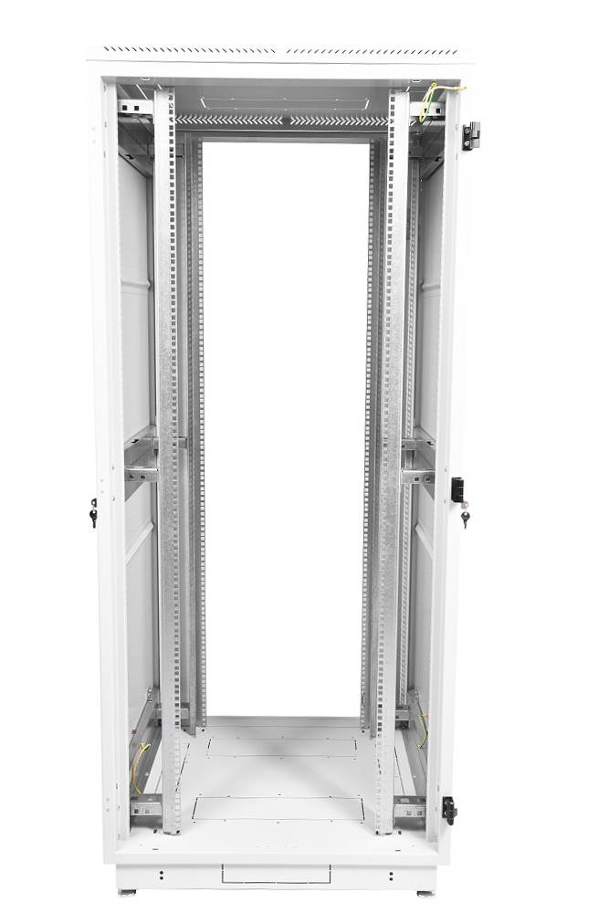 В комплект поставки входят четыре юнитовых направляющих из оцинкованной стали толщиной 2 мм, крыша и фальшпол, две усиленные боковые стенки и задняя стенка с точечными замками, дверь со стеклом, четыре винтовые опоры, компенсирующие неровности пола. Размер шкафа — 600×1000×2250 мм, вес — 126.54 кг.