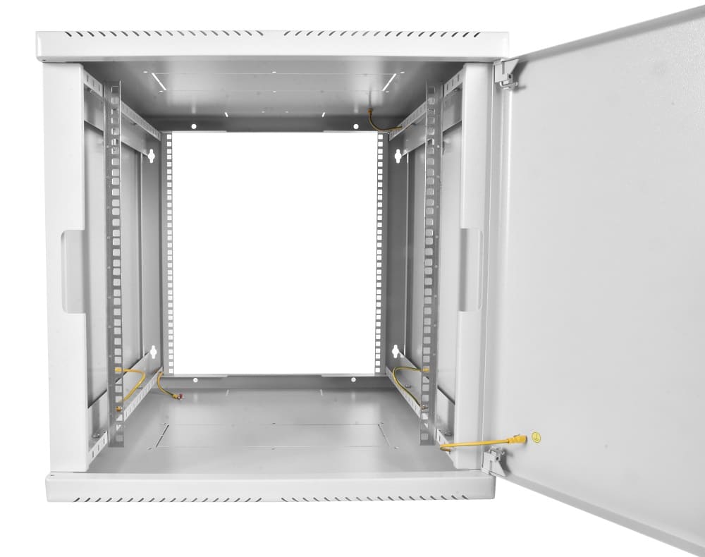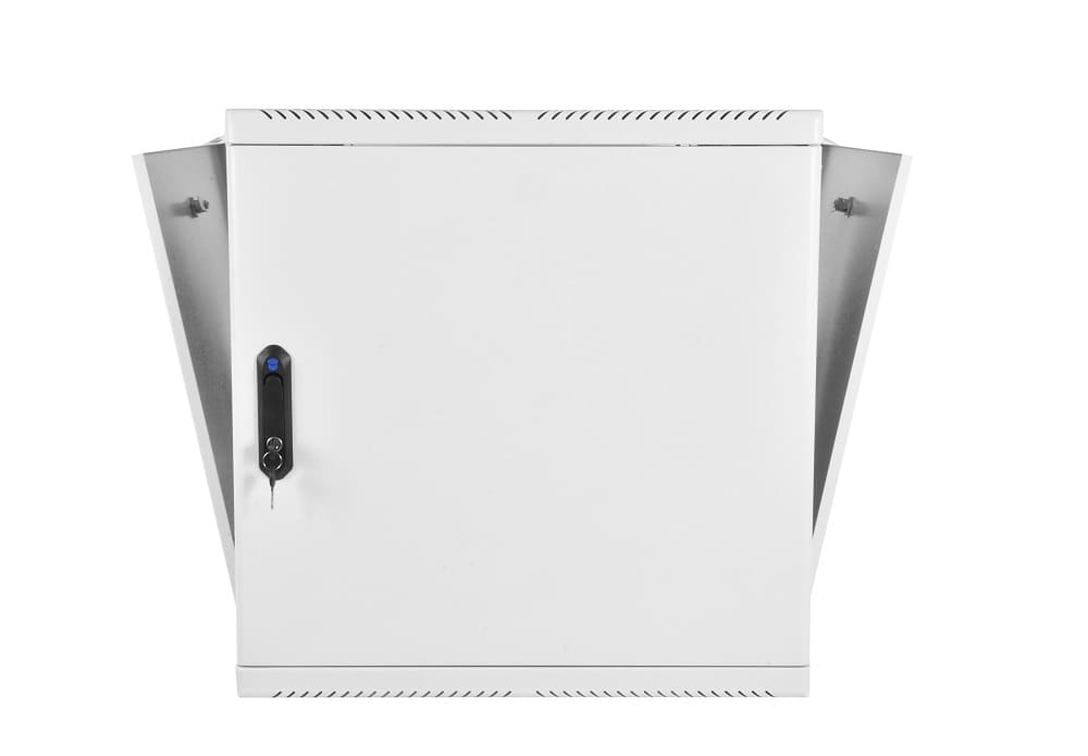 Предусмотрено по кабельному вводу 94?40 мм в верхней и нижней части корпуса; вводы заглушены. Листовые детали окрашены порошковой краской светло-серого (RAL 7035) цвета, направляющие оцинкованы. Из-за навесного монтажа в стандартную комплектацию не включена задняя стенка, но ее можно купить в процессе заказа. Шкаф изготовлен из стали толщиной до 2 мм, поставляется разобранным — в плоской упаковке, удобной для транспортировки. Размер — 600?650?746 мм, вес — 27.36 кг.