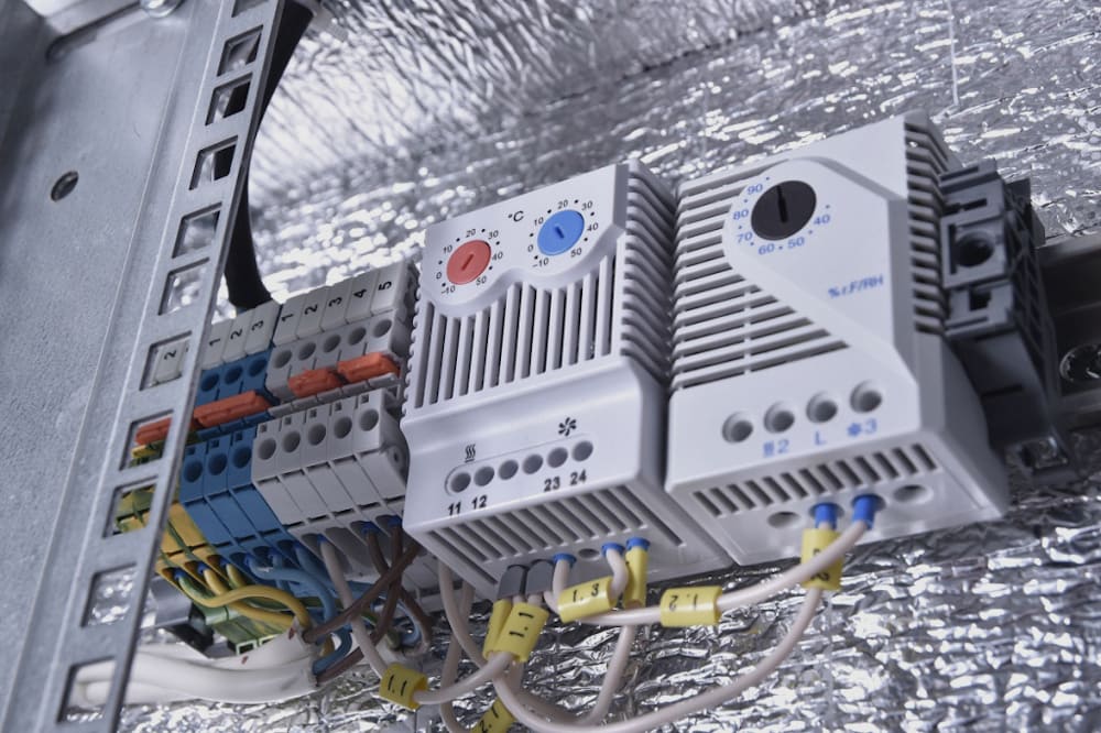 В телекоммуникационном отсеке на двух DIN-рейках размещено электрооборудование и датчики: гигростат и терморегулятор – на верхней, аппараты ВРУ и обогреватель – на нижней. Уровень защиты от поражения электрическим током – класс I по ГОСТ IEC 61140-2012, ГОСТ 12.2.027.0-96.