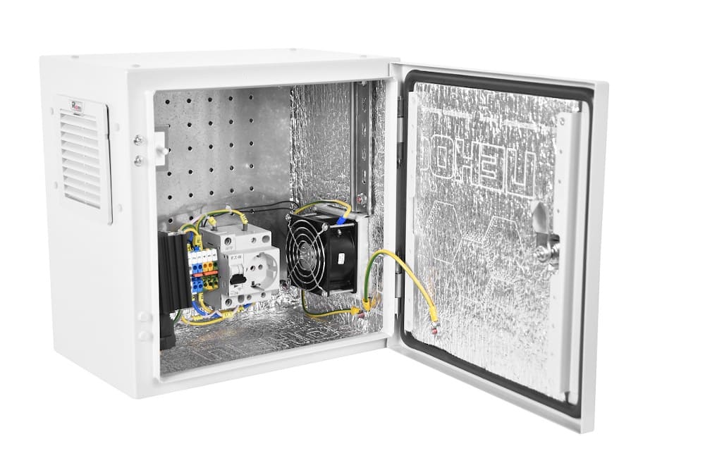 Термоизоляция: Внутренние поверхности шкафа покрыты термоизоляционным фольгированным материалом, который помогает поддерживать стабильную температуру внутри шкафа и защищает оборудование от перегрева и переохлаждения.
