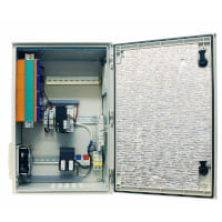 - Вентилятора, активируемого по сигналу отдельного термостата (нормально открытый, от +35 ºС), и решеток с сетчатыми фильтрами (стандарт защиты от пыли и влаги IP54).