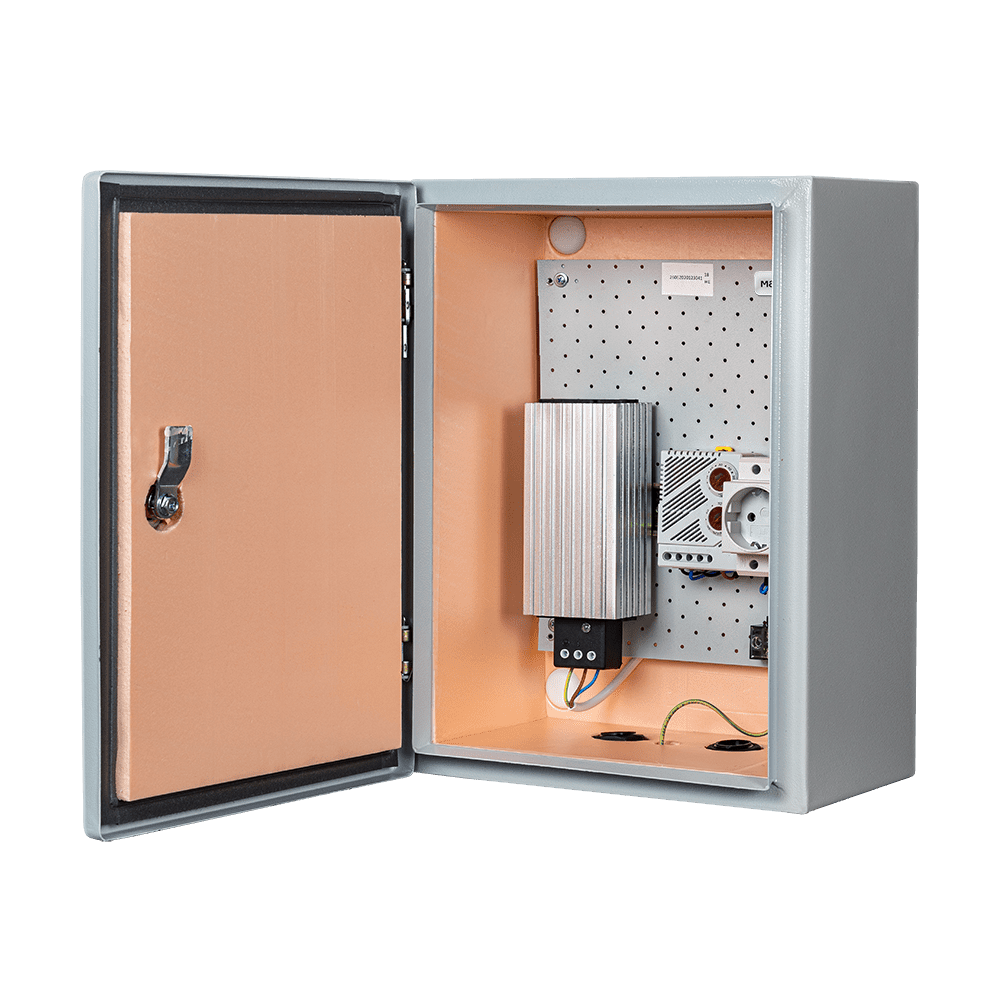 Электротехнический шкаф Mastermann «Мастер 2 УТ-Л» изготовлен из листовой стали марки Ст3 толщиной 1.5 мм. Адаптирован к уличной эксплуатации в любое время года — в диапазоне температур –55 °С… +50 °С под непосредственным воздействием осадков. Отвечает требованиям ТУ 4372-002-62942652-2016, соответствует классу I по ГОСТ 12.2.007.0 (защита от поражения электрическим током), IP66 по ГОСТ 14254-96, ГОСТ 15150-69. Укомплектован системой контроля температуры и влажности: электронным гигростатом NT 78-M, контролирующим уровень влажности и при необходимости включающим обогреватель, обогревателем HG 140 мощностью 75 Вт, автоматическим выключателем 10 А. Оборудование установлено на DIN-рейку. Предусмотрены DIN-розетка с заземлением, два гермоввода MG-25, клеммная колодка.