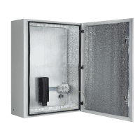 Электротехнический шкаф Mastermann «Мастер 5 УТ» выполнен из окрашенной листовой стали (марка Ст3) толщиной 2 мм. Адаптирован к уличной эксплуатации вне зависимости от времени года — под непосредственным воздействием осадков. Соответствует ТУ 4372-002-62942652-2016, классу I по ГОСТ 12.2.007.0 (защита от поражения электрическим током), IP66 по ГОСТ 14254-96, ГОСТ 15150-69 (рабочие температуры –55 °С… +50 °С). Укомплектован DIN-рейкой. На рейку установлены DIN-розетка 10 А с заземлением, автоматический выключатель 10 А, нормально закрытое термореле KTO 011, обогреватель HG 140 мощностью 250 Вт. Предусмотрены два гермоввода MG-25 (с мембраной, IP68) из полиамида, клеммная колодка.