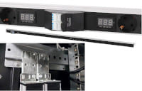 Вертикальный 2-контурный блок силовых розеток Rem R-32-10S-8C13-10C19-A-Am-1420-К для стойки или шкафа высотой 33–48 U оборудован двумя клеммными колодками, двумя амперметрами, двумя 16-амперными автоматическими выключателями, десятью Schuko, восемью IEC 60320 C13 и десятью IEC 60320 C19. Изготовлен в системе несущих конструкций 482.6 мм по ГОСТ 28601.2 (19" по МЭК 297). Для удобства подключения коленчатых штекеров розетки Schuko расположены под углом 45°.