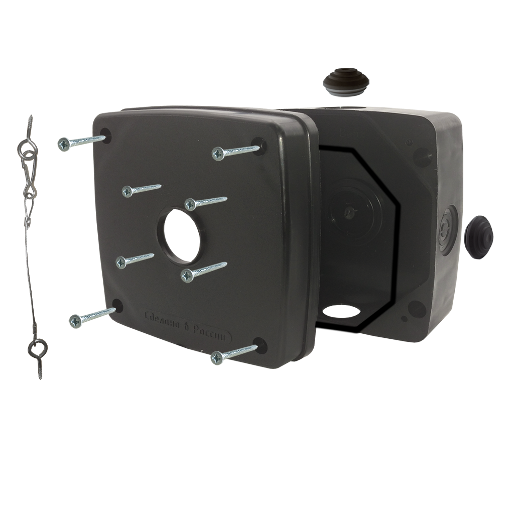 Монтажная коробка ST-K01 PRO (ЧЕРНАЯ), Универсальная монтажная коробка для видеокамер охранного наблюдения, предназначена для установки и подключения видеокамер охранного видеонаблюдения, Габаритные размеры: 140х140х66 мм, Максимальная нагрузка: 2,5 кг, Пластик, Цвет: Черный, Рабочая температура: -50…+60°С, Степень защищенности: IP 66, Вес нетто: 0,23 кг, Комплектность: Шайба уплотнительная-2шт.,Сальник для ввода гофротрубы-2 шт.,Саморез (крепл. кам.) 3,9х16 мм-4шт.,Саморез (креп.крыш.) 4х40 мм-4шт.,Саморез (креп.к стене) 4х60 мм-4шт.,Дюбель распорный 6*35 мм-4шт.,Шнур уплотнительный-1шт.,Карабин тип А-1шт.,Кольцо шуруп 3х15 мм-2шт.,Тросик-1шт.,Сальник PG-7-1шт.