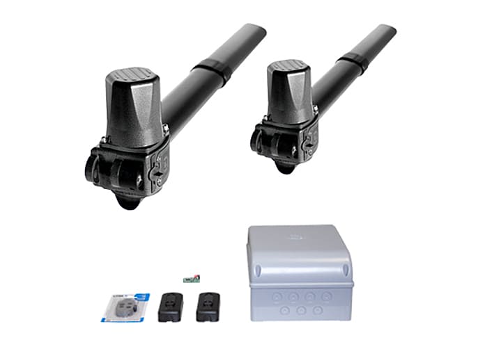 Комплект Came Krono (001U1411RU) для автоматизации распашных ворот с двумя створками шириной до 3 м, весом до 800 кг включает в себя два привода — KR310D и KR310S, блок управления ZF1N, фотоэлемент DIR10, плату-радиоприемник AF43S и два пульта ДУ TOP44RGR.