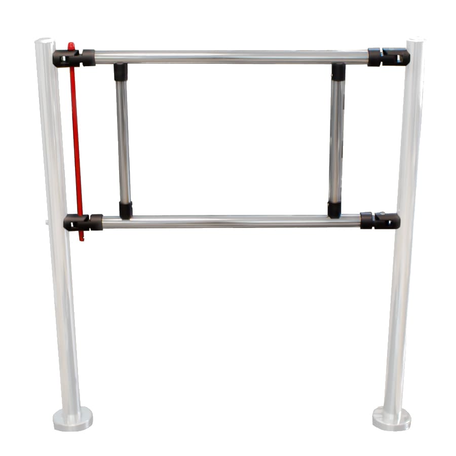 Комплект модульного ограждения 3V «антипаника» 1 м состоит из двух хромированных поручней с четырьмя шарнирами, двух перемычек, четырех стальных стаканов для их крепления и красного привлекающего взгляд штыря для крепления на одной из вертикальных стоек (в комплект не входят, отдельный заказ) секции. При переходе в режим «антипаника» штырь разблокировки быстро изымают, а створку распахивают.