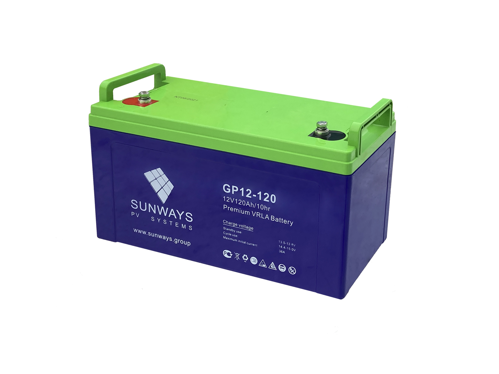 Аккумуляторные батареи Sunways серии GP являются универсальными и предназначены для работы в охранных, пожарных, солнечных энергосистемах, системах бесперебойного питания и ветрогенераторных установках. Корпус таких батарей полностью герметичен и выполнен из негорючего ABS пластика, что исключает возможность выделения кислотных паров и водорода. Это позволяет отнести батареи к необслуживаемым и эксплуатировать их внутри жилых и офисных помещений. При производстве аккумуляторов применена технология AGM (Absorbed Glass Mat). Они предназначены для работы как в циклическом, так и буферном режиме. Аккумуляторные батареи серии GP – одно из лучших предложений на рынке благодаря продолжительному сроку службы (10 - 12 лет), улучшенным зарядным характеристикам, абсолютной герметизации корпуса и доступной цене.
