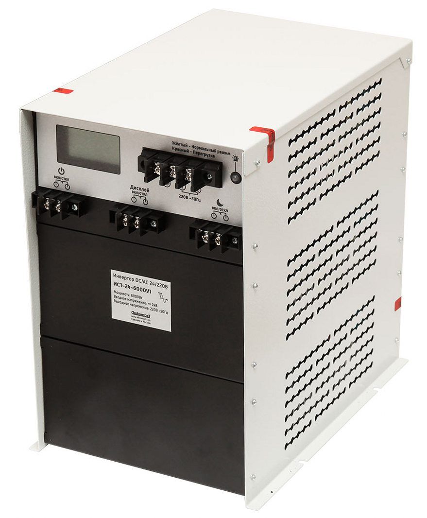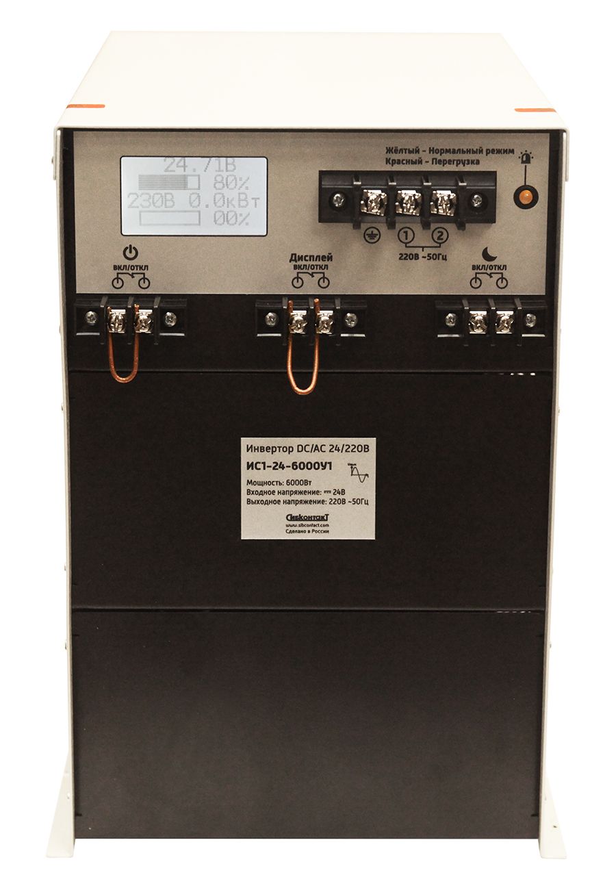 ИС1-24-6000У1 – это синусный инвертор, позволяющий получить напряжение 220В с частотой 50Гц, из поступающего на вход низковольтного потока 24В. Это обеспечивает стабильное энергообеспечение для любых электроприборов до 6000Вт, подключенных к прибору. Выдаваемое напряжение соответствует характеристикам бытовой сети.