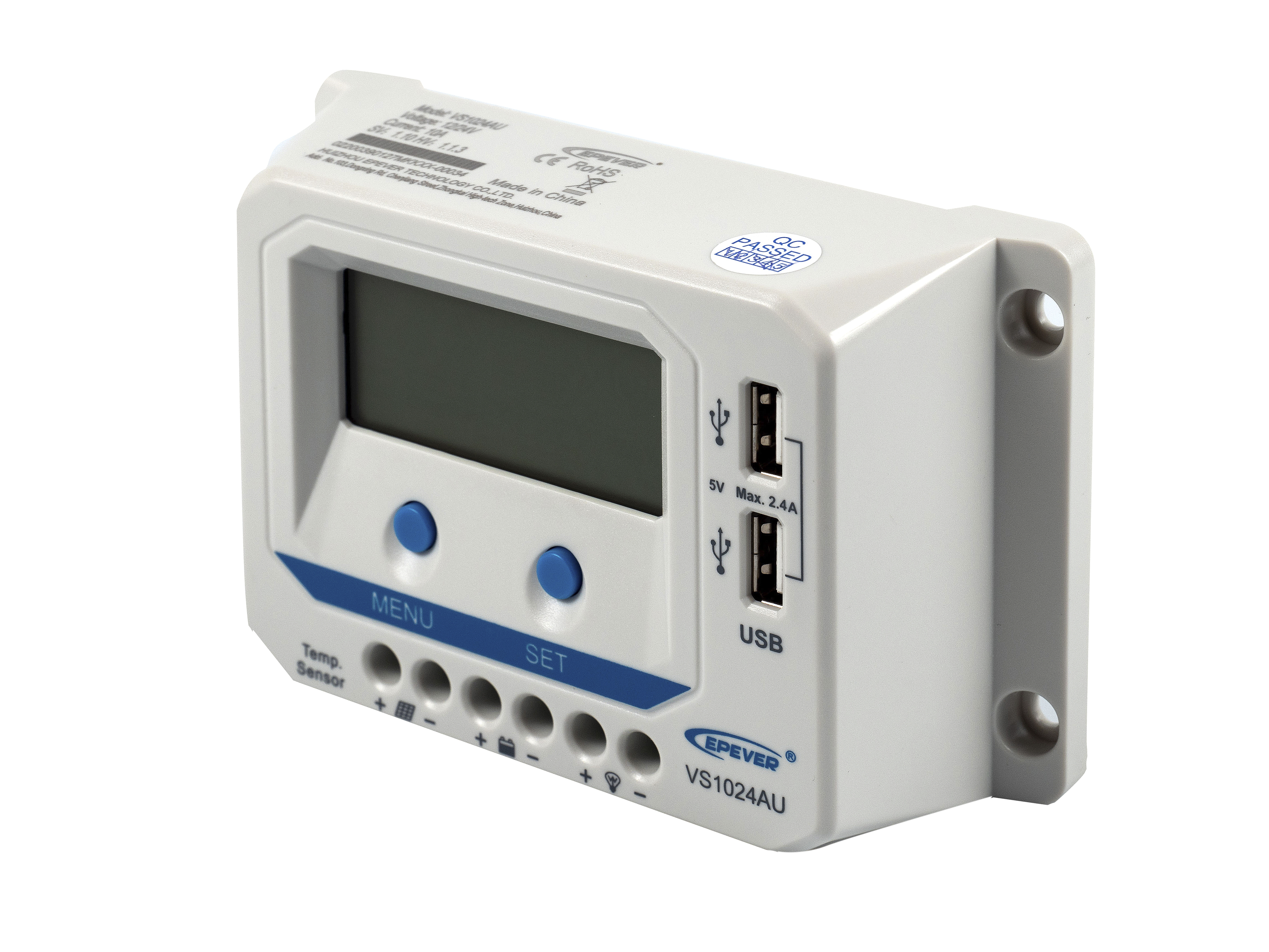 Контроллер заряда VS1024AU имеет встроенный ЖК-дисплей и USB-порт. Предусмотрено несколько режимов управления нагрузкой, позволяющих применять контроллер в солнечной домашней системе, системе безопасности, автономной системе освещения и т.д. Электроэнергия от модуля, может передаваться аккумуляторам без регулирующих устройств или через контроллер.