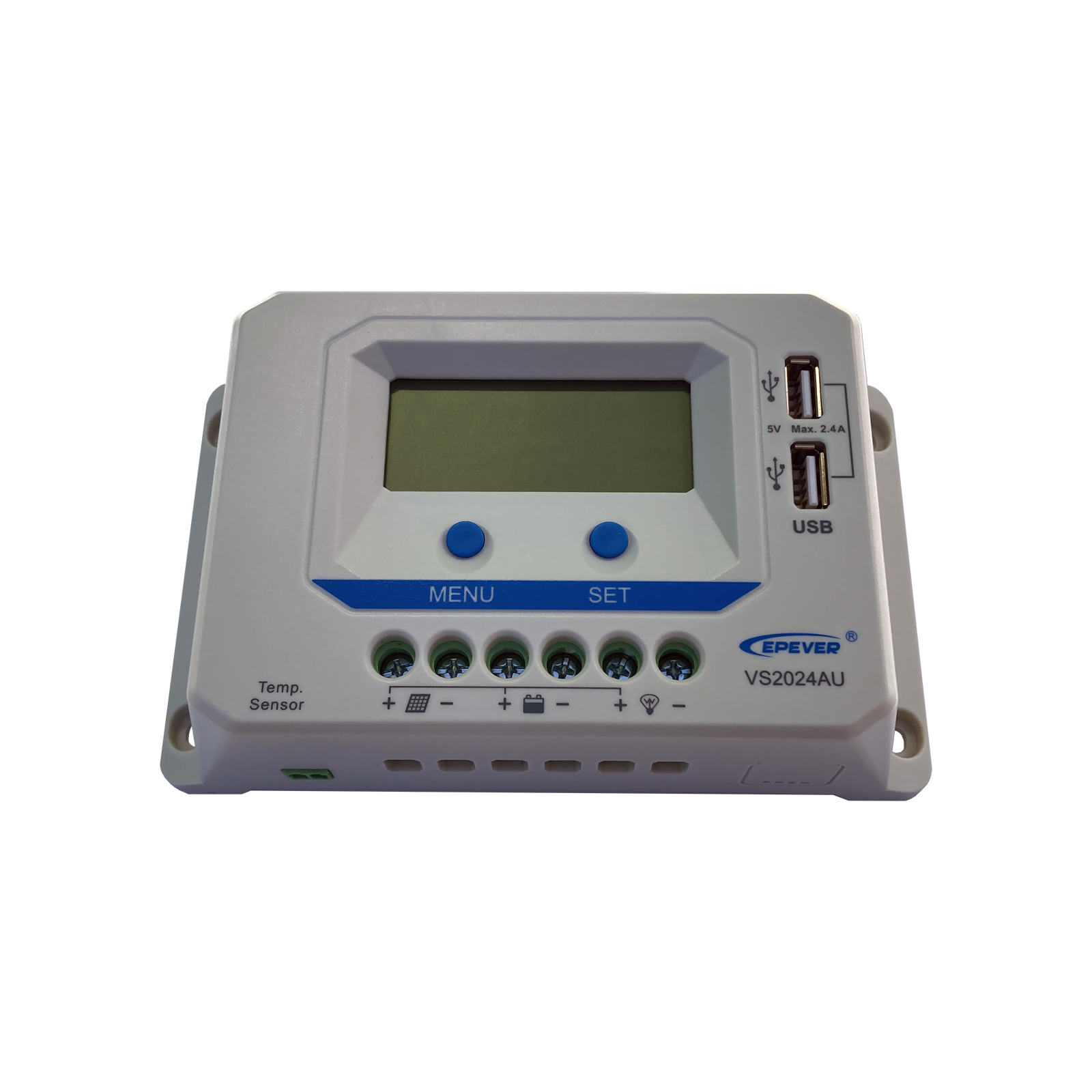 Контроллер заряда VS2024AU имеет встроенный ЖК-дисплей и USB-порт.